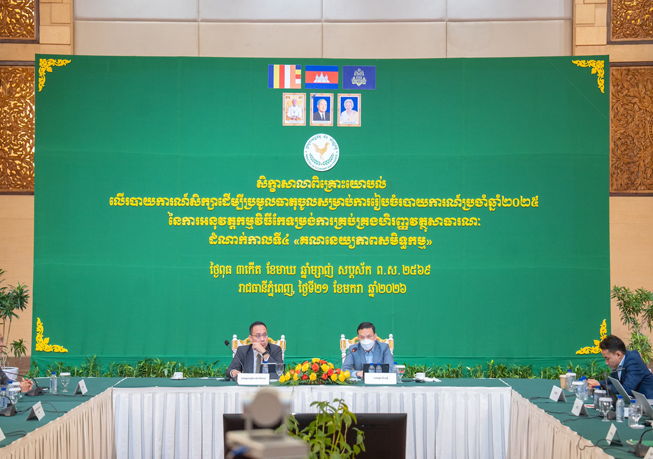 នាថ្ងៃពុធ ៣កើត ខែមាឃ ឆ្នាំម្សាញ់ សប្ដស័ក ព.ស.២៥៦៩ ត្រូវនឹងថ្ងៃទី២១ ខែមករា ឆ្នាំ២០២៦ ឯកឧត្ដមបណ្ឌិត យ៉េត វីណែល អនុរដ្ឋលេខាធិការ នៃ ក្រសួងសេដ្ឋកិច្ចនិងហិរញ្ញវត្ថុ (កសហវ.) និងជាអគ្គលេខាធិការរង នៃអគ្គលេខាធិការដ្ឋានគណៈកម្មាធិការដឹកនាំការងារកែទម្រង់ការគ្រប់គ្រងហិរញ្ញវត្ថុសាធារណៈ (អ.គ.ហ.) តំណាងដ៏ខ្ពង់ខ្ពស់របស់ ឯកឧត្ដម រស់ សីលវ៉ា រដ្ឋលេខាធិការ នៃ កសហវ. និងជាអគ្គលេខាធិការ នៃ អ.គ.ហ. អមដោយ ឯកឧត្ដម អ៊ុំ យុទ្ធី នាយករដ្ឋបាល ហិរញ្ញវត្ថុ និងត្រួតពិនិត្យនិងវាយតម្លៃ នៃ អ.គ.ហ., មន្ត្រីជំនាញជាន់ខ្ពស់ និងមន្ត្រីជំនាញ នៃ អ.គ.ហ. បាន ដឹកនាំសិក្ខាសាលាពិគ្រោះយោបល់លើរបាយការណ៍សិក្សាចំនួន ៣ ដែលជាការសិក្សាប្រមូលធាតុចូលសម្រាប់ការការរៀបចំរបាយការណ៍វឌ្ឍនភាពប្រចាំឆ្នាំ២០២៥ នៃការអនុវត្តកម្មវិធីកែទម្រង់ការគ្រប់គ្រងសាធារណៈ ដំណាក់កាលទី៤ “គណនេយ្យភាពសមិទ្ធកម្ម” ។ កិច្ចប្រជុំនេះ មានការចូលរួមពី ឯកឧត្ដម លោកជំទាវ លោក លោកស្រី ជាតំណាងមកពីគ្រប់អង្គភាពក្រោមឱវាទ កសហវ. រួមទាំងមន្ទីរ សហវ. ទាំង ២៥ រាជធានី-ខេត្ត និងក្រសួង-ស្ថាប័ន សរុបប្រមាណ ២០០រូប។